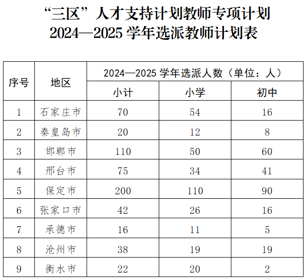 根據各地上報需求情況,2024—2025學年全省計劃選派“三區”支教教師593人,均為義務教育階段。各市具體選派名額見附件。